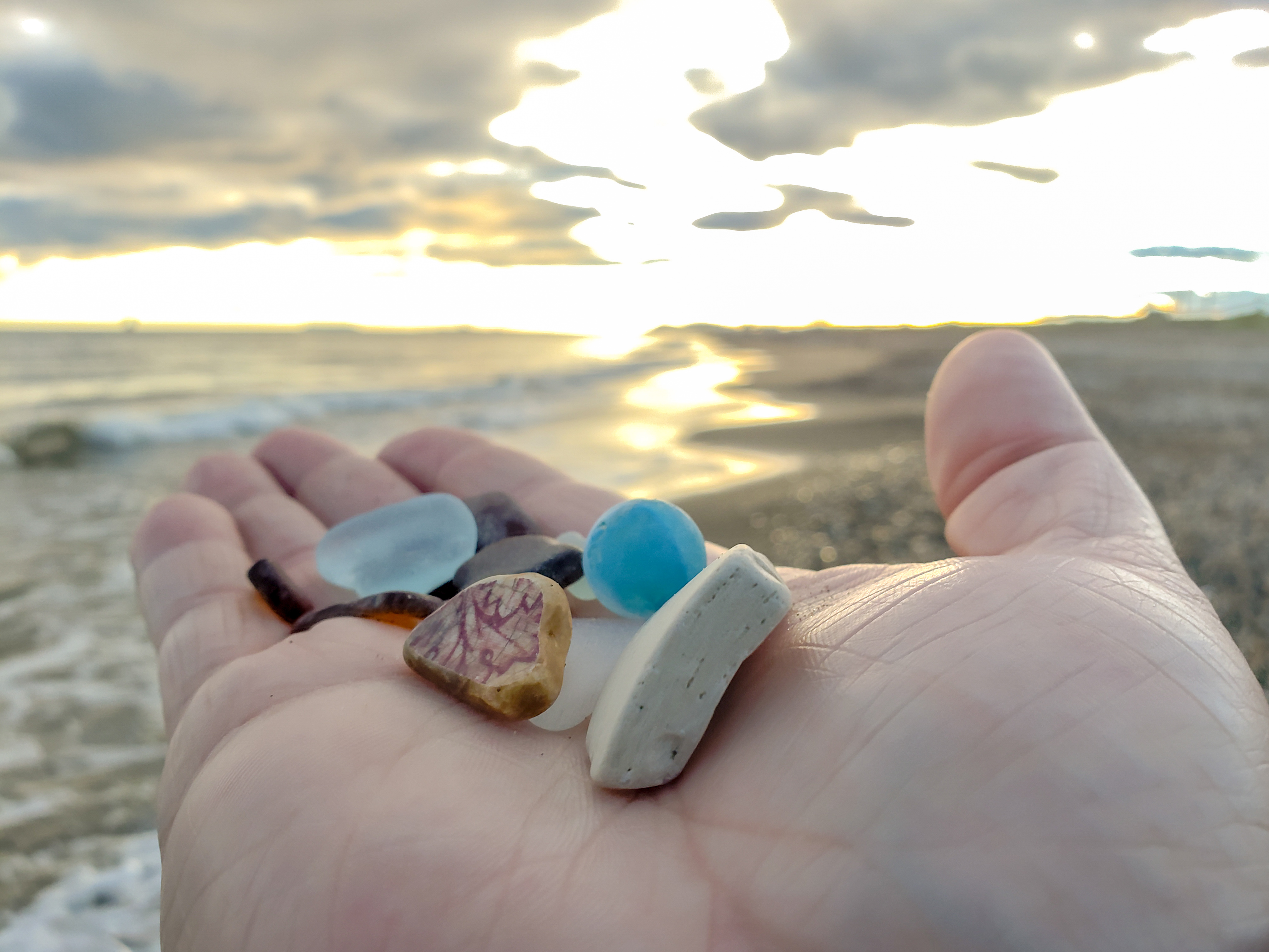 Today was not easy but I made it through, with God’s strength. I didn’t leave for the beach until about 9:30pm, but once down there, I walked for quite a ways. Lots of little treasures are to be found after a storm: patterned pottery pieces, a marble, fascinating metal fragments.